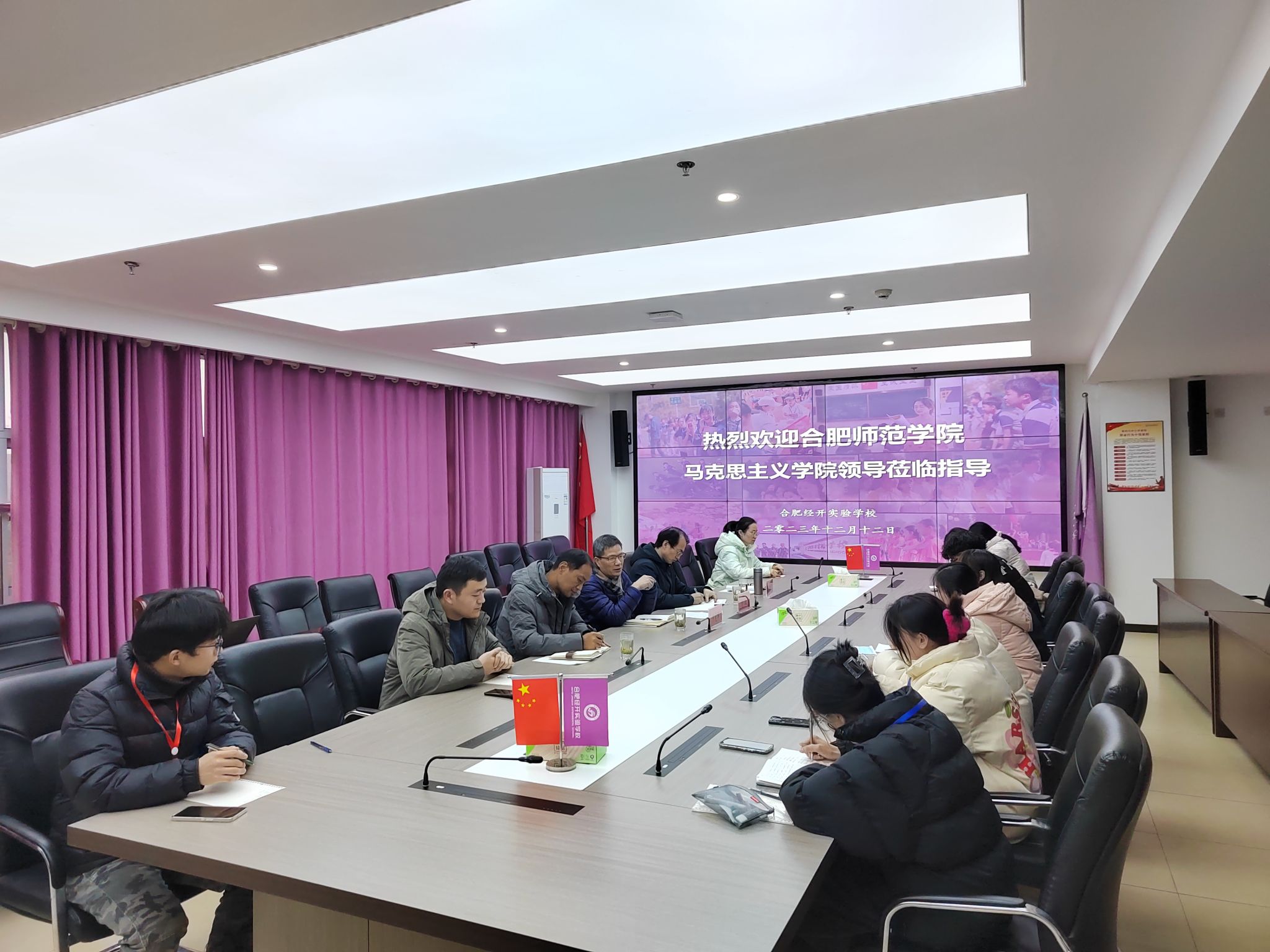 在校外实习学校合肥经开实验学校,双方共同召开了实习学生座谈会,实习学生、指导教师代表进行了汇报交流。双方一致认为,两个学校距离近,人员业务交流频繁,联系紧密,希望今后在师范生培养和课程教学改革方面进一步加强交流合作。会后,一行人参观了合肥经开实验学校的硬件设施并听取了学校领导关于该校办学理念、课程改革和“五育”融通育全人具体做法等方面的介绍。
