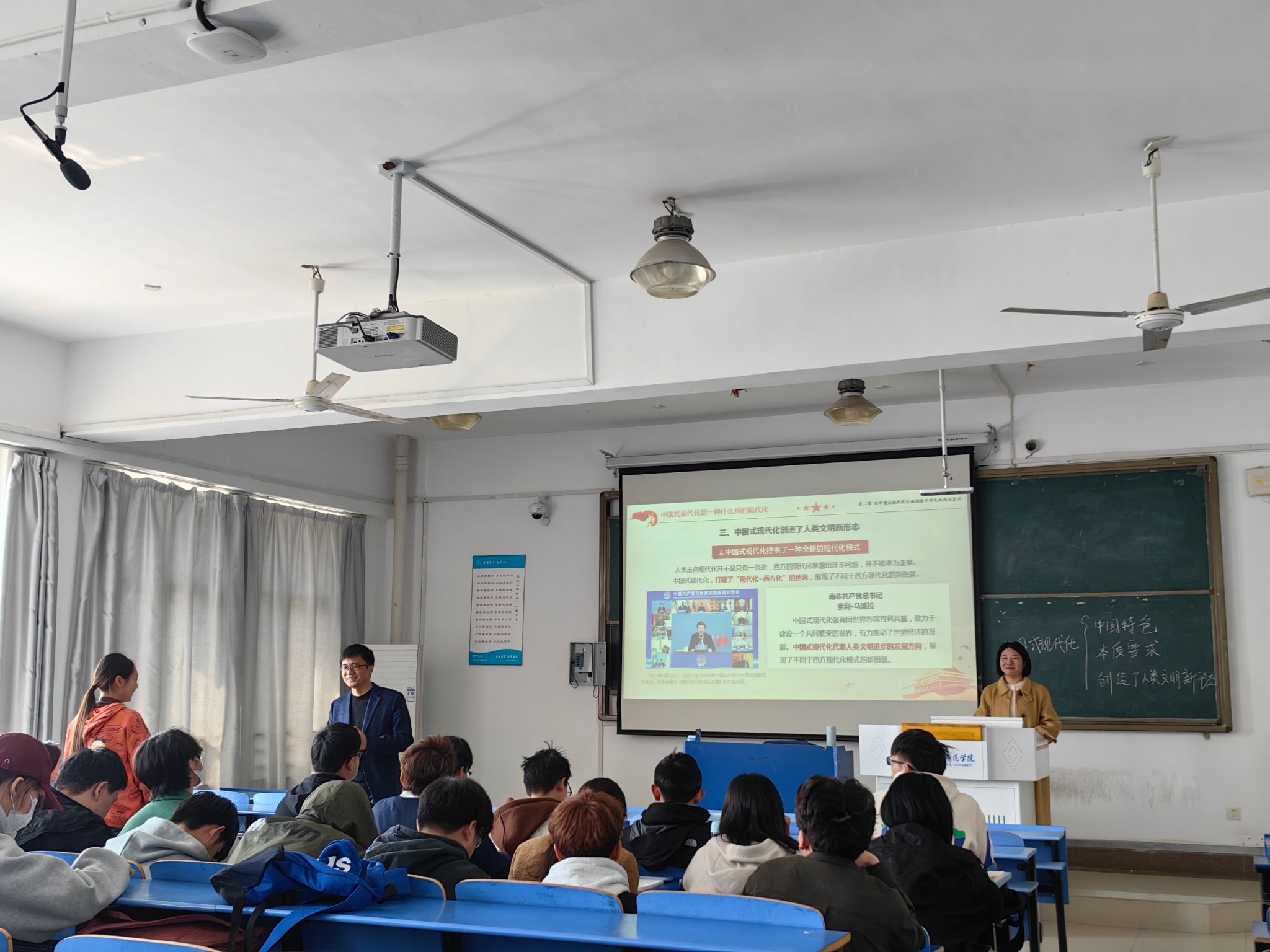 在逸夫楼A406教室,首先由蒋娟老师以问题式导入本节专题“中国式现代化是强国建设和民族复兴的唯一正确道路”。蒋娟以学生为主体,以问题为导向,通过问题链分析阐释中国式现代化的中国特色和本质要求。她以视频方式引入“为什么说中国式现代化创造了人类文明新形态?”随后,教研室主任张军占老师从人类文明新形态的内涵,人类文明新形态“新”在哪里?运用对比的方式,分析中国式现代化是一种全新的现代化模式、是对西方式现代化理论与实践的重大超越、是人类现代化道路的全新选择。