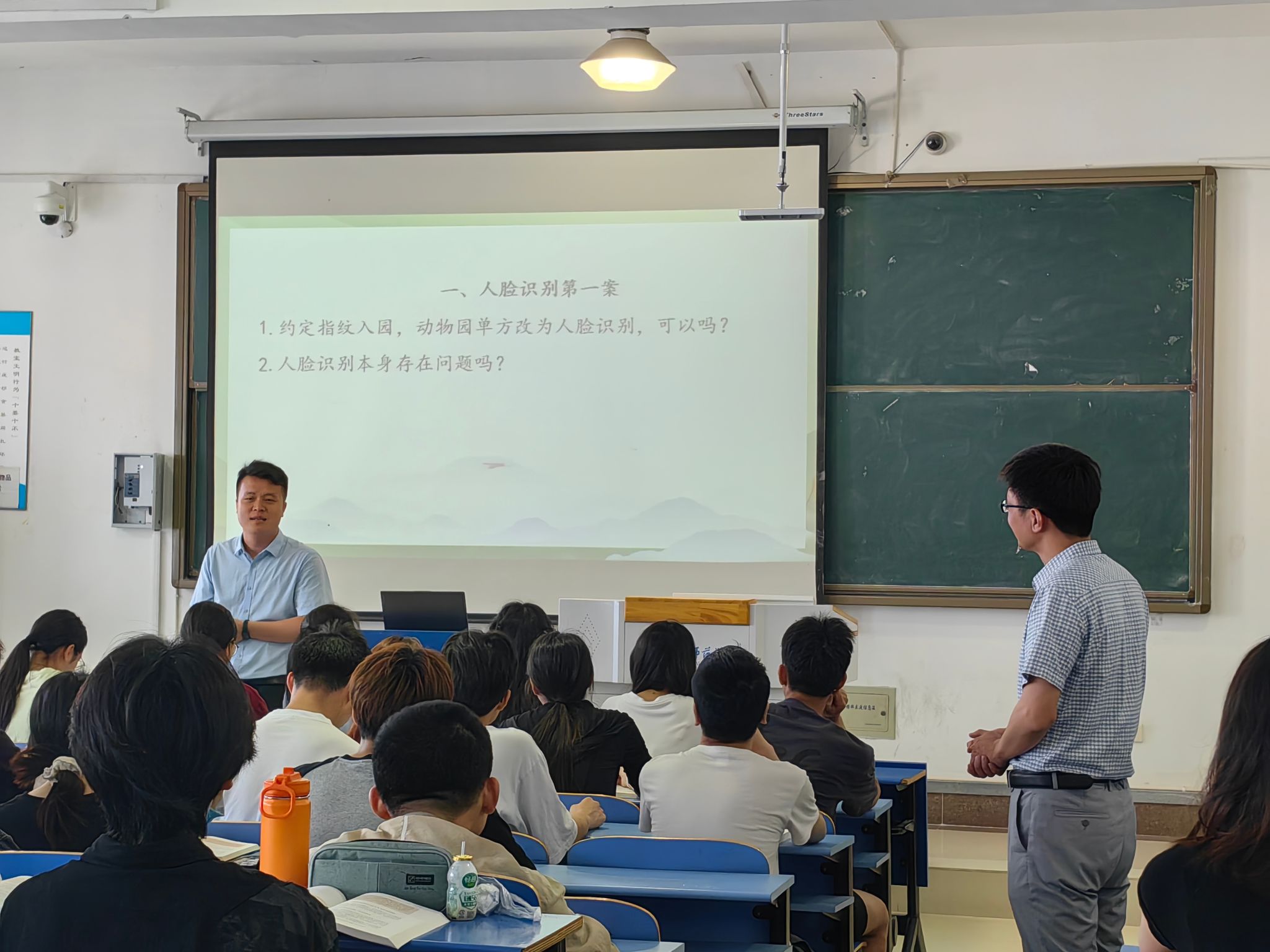 本节课主讲人张军占老师以“人脸识别第一案”作为新课导入案例,稍加说明后,随即由法学博士谷向阳老师从《消费者权益保护法》《合同法》《中华人民共和国民法典》等不同法律角度,解读案例及其判决结果,有针对性地引导学生初步理解“全面依法治国”的重要性;同时,因导入案例贴近学生实际,加上“多师同上”的新颖教学形式,也将学生的听课兴趣充分调动起来。