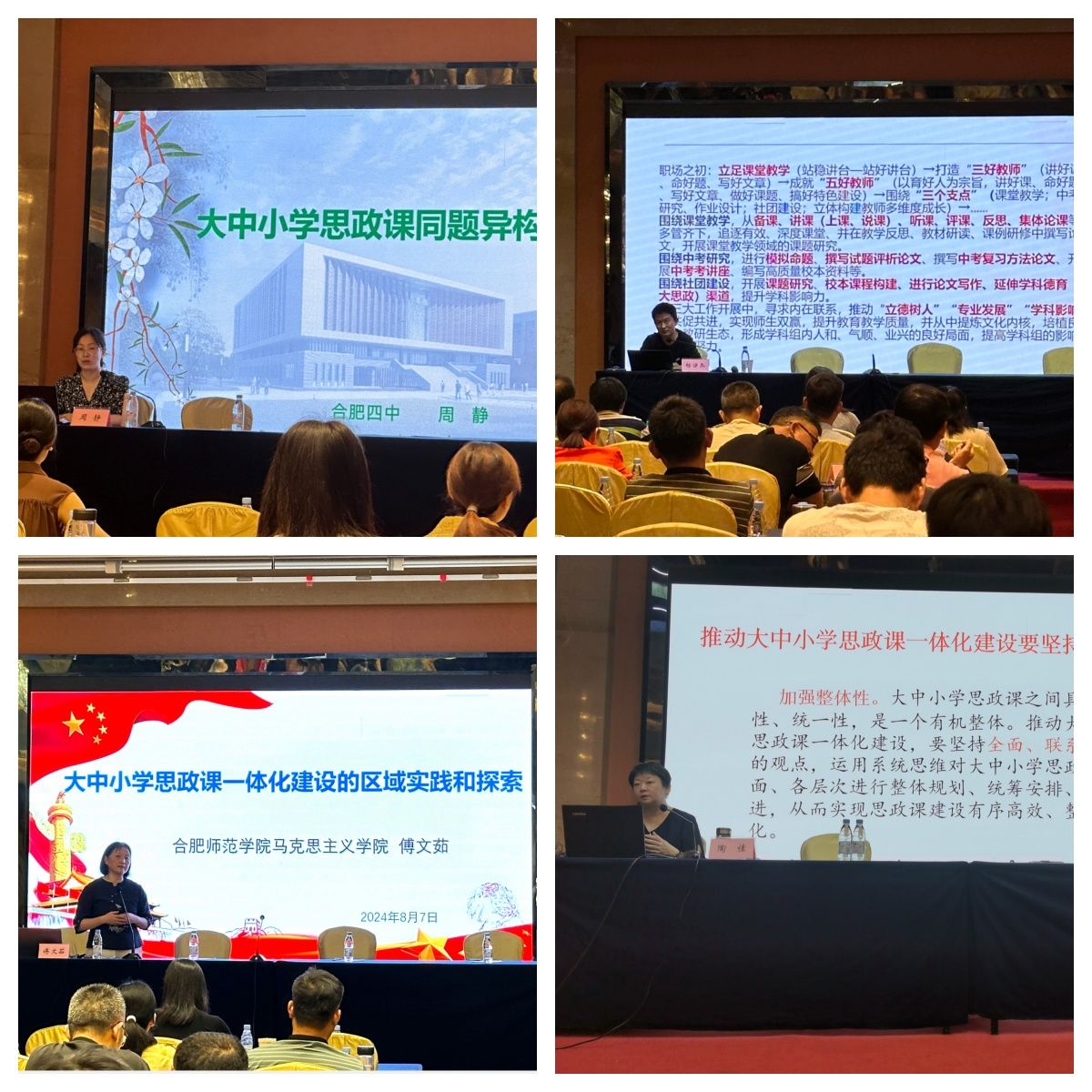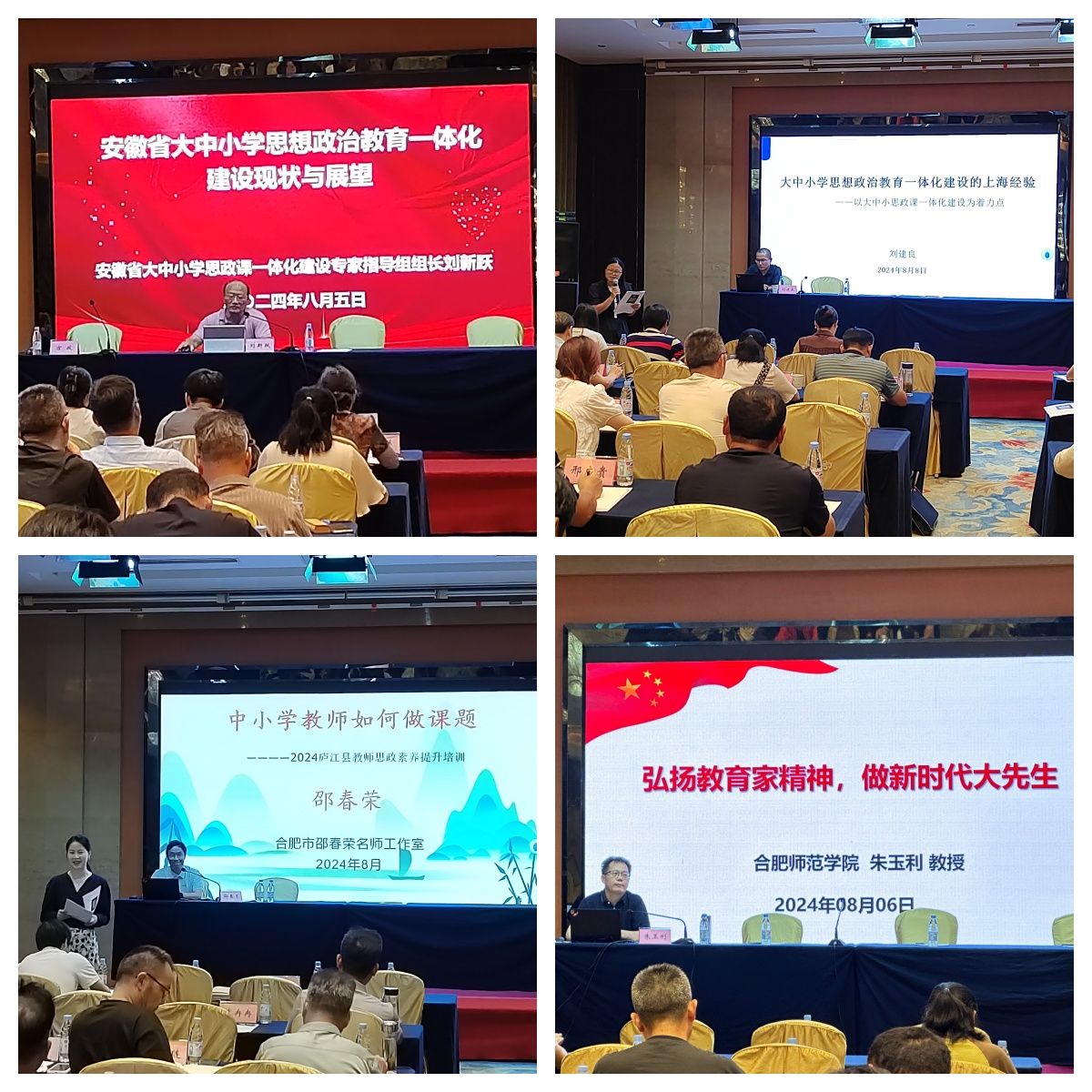 安徽省大中小学思政课一体化建设专家指导组组长刘新跃介绍了大中小学思想政治教育一体化建设的历史、安徽省建设现状与未来展望。合肥市名师工作室领衔人杨使兵结合自己的成长经历,强调了教研赋能教师专业化发展的重要性。合肥市第四中学政治学科主任周静从理论和实践两个角度诠释了思政课“同题异构”教学设计。上海师范大学MILE米乐集团思政教师教育教研室主任刘建良给大家带来了大中小学思政教育一体化建设的上海实践经验。合肥市梦园小学教育集团校长邵春荣结合自身经历介绍了中小学教师如何做好课题研究。庐江县教育体育局教研员陶佳总结了庐江县近几年来在中小学思政课一体化建设的生动实践经验,强调要坚持系统思维来指导庐江县的继续探索工作。米乐官网MILE米乐集团朱玉利和傅文茹两位专家,分别围绕弘扬“教育家精神”与合肥市一体化建设成果做了专题报告,并得到参训学员的好评。