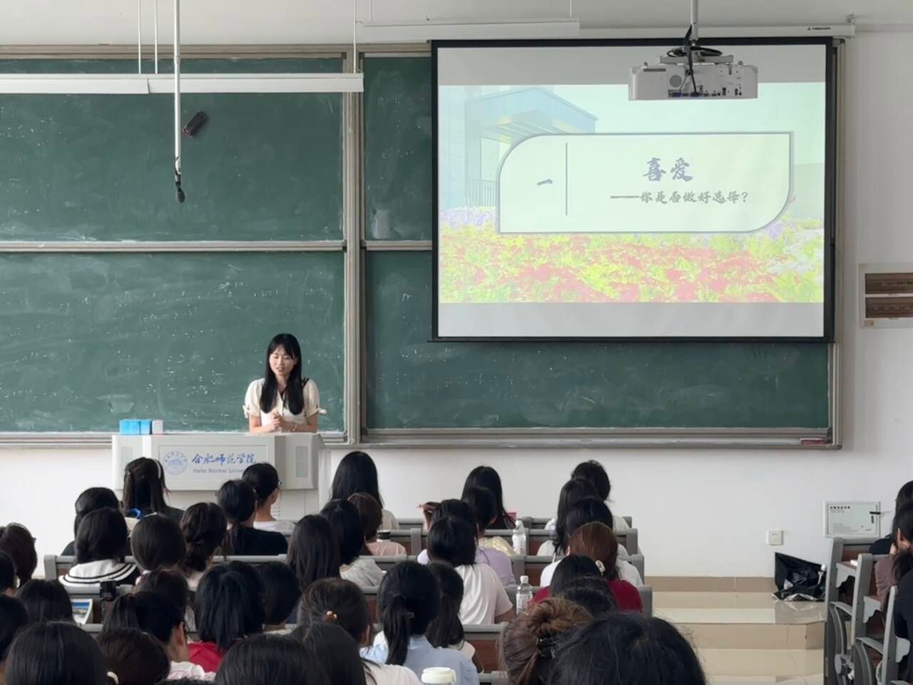 合肥市第一中学思政课教师周子寒以《青年教师角度谈师范生成长》为题,和新生分享了自己在求学工作过程中的成长经历,从“喜爱——你是否做好选择”“逐爱——你是否准备充足”“热爱——前路漫漫亦灿灿”三个角度分享了自己宝贵的成长经验。通过自己如何从一个内向不敢上台的学生蜕变成勇于在讲台展现自己的教师的经历,引导新生要加强锻炼,勇于上台展示。通过自身准备考编的故事,强调万事要提前做好准备,厚积薄发,机会都是留给有准备的人。
