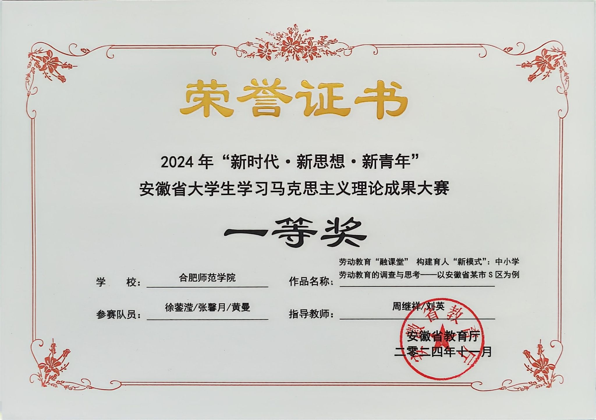 学校今年首次将此项比赛纳入思政综合实践课课程,全校大二学生全员参与,其他年级学生自愿参与,有4000多位学生参加比赛,较往年扩大了覆盖面,提升了影响力。经过班级初选、校级初赛、决赛三级选拔,实现了优中选优,提升报送作品的质量。最终,徐蓥莹、张馨月、黄曼同学的作品《劳动教育“融课堂”构建育人“新模式”:中小学劳动教育的调查与思考——以安徽省某市S区为例》(指导老师:周继祥、刘英)荣获调研报告一等奖,王文杰同学的作品《新时代大学生美育素养提升路径》(指导老师:朱玉利)荣获论文三等奖,王代源、卢佳杰、李梦瑶同学的作品《赓续红色精神,书写青春之路》(指导老师:魏兵、吴石英)荣获微视频三等奖。