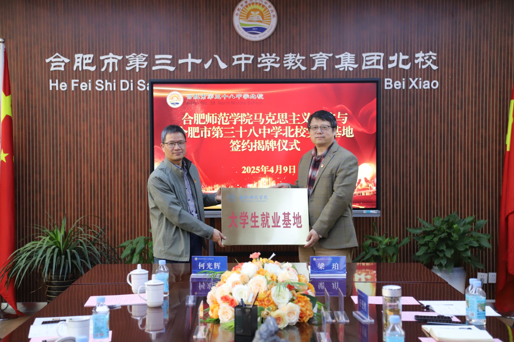 期间,何光辉代表学院与合肥市第三十八中学北校签订了大学生就业基地协议,双方隆重举行了共建就业基地的授牌仪式。