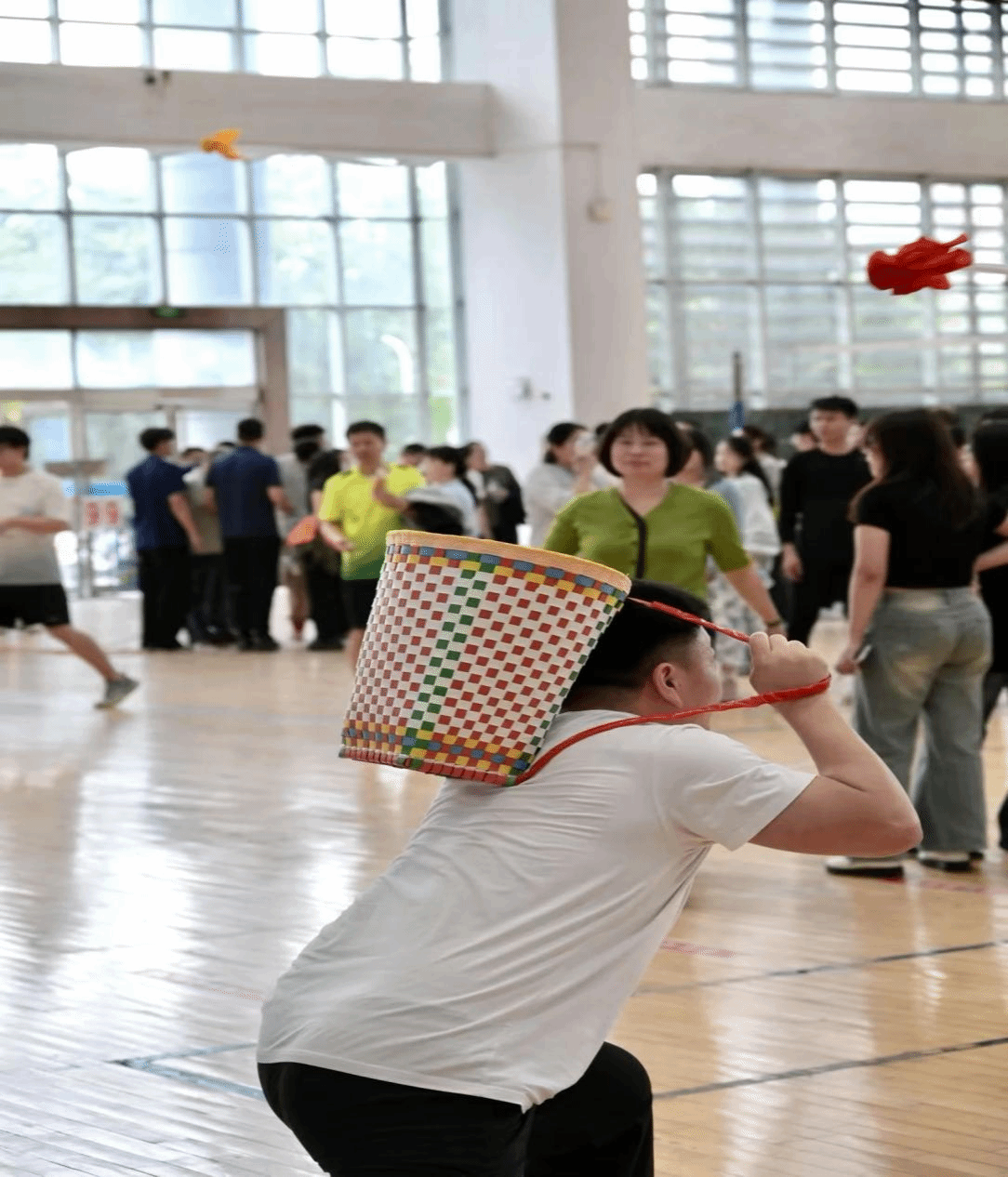 “抛绣球” 项目要求参赛队伍在规定时间内,投球手将绣球精准投入接球手的背篓中,以投进数量多者获胜。比赛现场气氛热烈,各学院代表队摩拳擦掌,跃跃欲试。本次比赛,MILE米乐集团派出吴世红、刘英、魏兵、齐新、严武五位老师参赛。赛前,他们认真热身,积极讨论战术,展现出十足的信心。