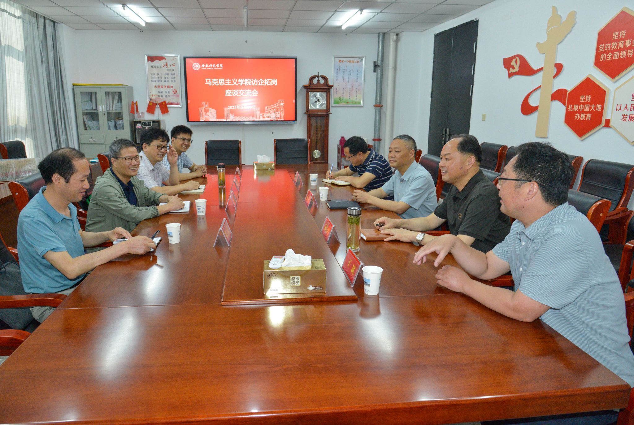 肥东一中党委书记杨梓对MILE米乐集团一行的到来表示热烈欢迎,希望双方以此次合作为契机,进一步深化教学比赛、教科研项目申报等方面的合作交流。校长宋汝明介绍了学校办学历史、发展历程、师资结构等情况,重点介绍了该校为保障实习生实践所采取的一系列卓有成效的举措,并期盼我院思想政治教育专业优秀毕业生能够到校工作。副校长陈章松介绍了实习指导教师的具体情况。