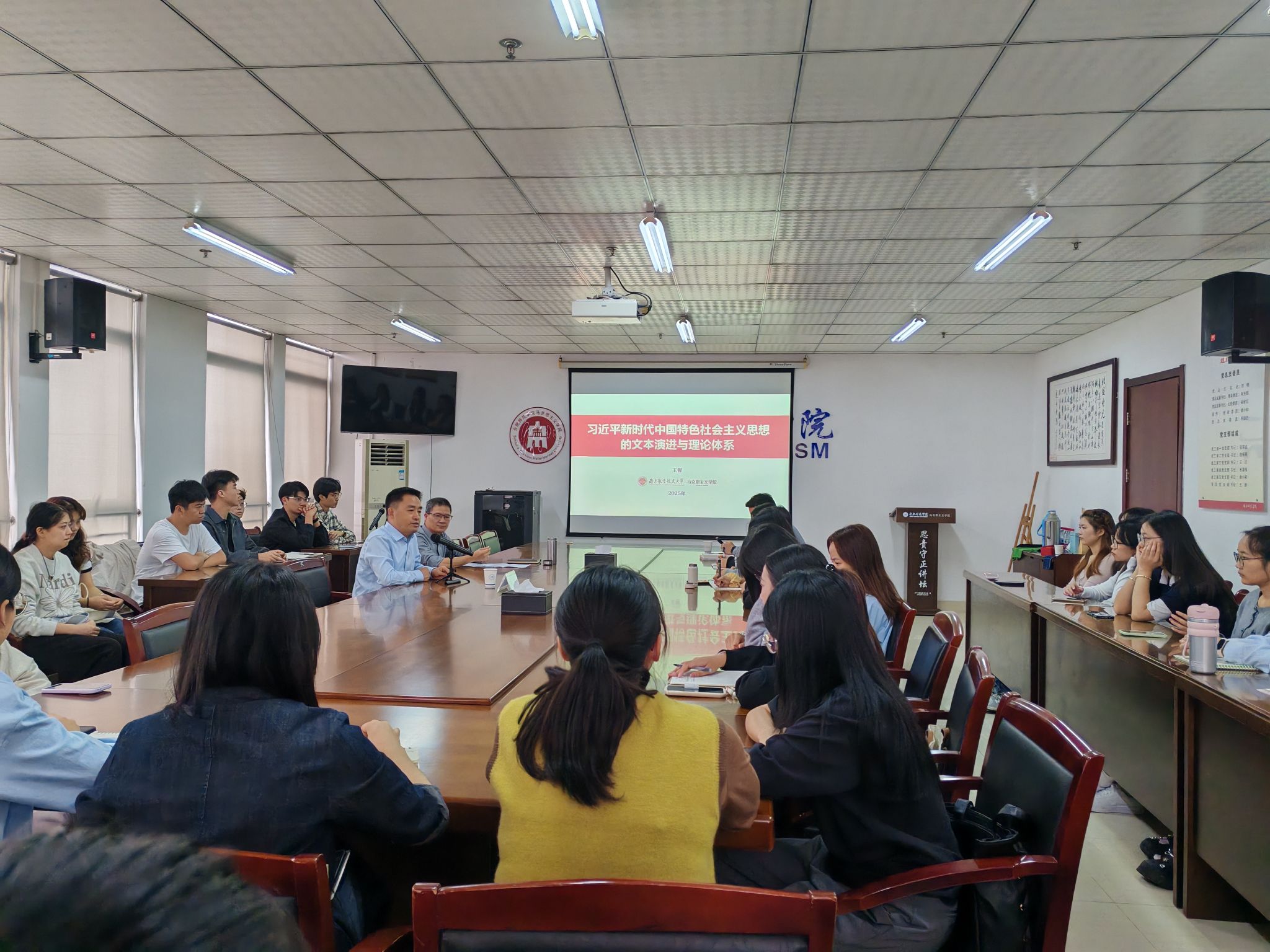 王智深情回顾了在母校的学习生活,讲述了求学奋斗历程,感恩母校严谨治学的氛围和老师们的教育引导,为自己的学术追求和教育理想打下了坚实的基础。他分享了自己在求学与职业生涯中遇到的挑战与收获,表达了愿意在学科建设和人才培养中努力回馈母校的良好愿望。他以“习近平新时代中国特色社会主义思想的文本演进与理论体系”的专题内容为例,鼓励同学们要踏踏实实读好书,深入研读马克思主义理论经典文本。