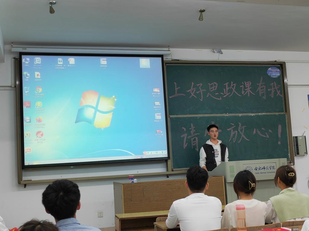 本网讯 为进一步贯彻落实习近平总书记“3·18”重要讲话精神,强化学生专业意识,增强学生专业能力,3月16日晚,我院傅文茹老师和章翅老师结合《中学思想政治(道德与法治)课程标准解读》和《中共党史》课程教学在锦绣校区博约楼214室联合开展课程特色主题实践。本次实践主题是“上好思政课有我,请党放心”,我院2021级思想政治教育专业班全体同学和2019级部分学生参加,应邀参加活动的有我院政法系主任何光辉教授、组织员束道锋、辅导员王萌和计算机学院辅导员龚永琦,本次活动由2021级学生赵璟丽主持。