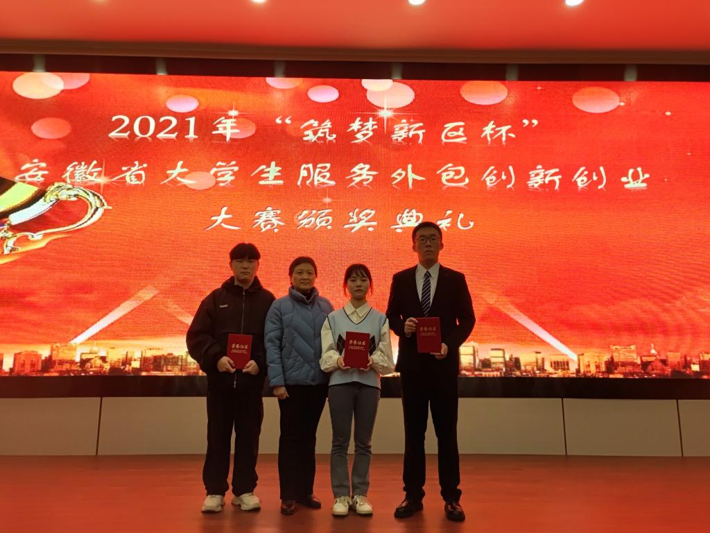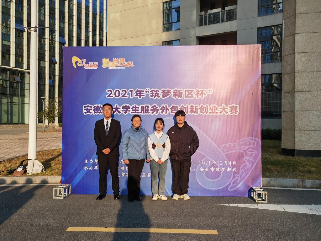 本网讯12月4日,由安徽省教育厅主办,安徽财经大学、安庆筑梦新区管委会承办的2021年“筑梦新区杯”安徽省大学生服务外包创新创业大赛在两个多月的过程中,经过报名、初赛、现场决赛终于落下帷幕。在决赛中,由我院傅文茹老师、合肥市第六十八中学葛守稳老师指导,陈玉钊(2019级思政班)、方媛(2019级思政班)、茌选正(2019级环境设计班)、张倩(2020级思政班)、夏文辉(2020级思政班)五位同学组成的“速速降压队”经过激烈的角逐,最终荣获省级一等奖。