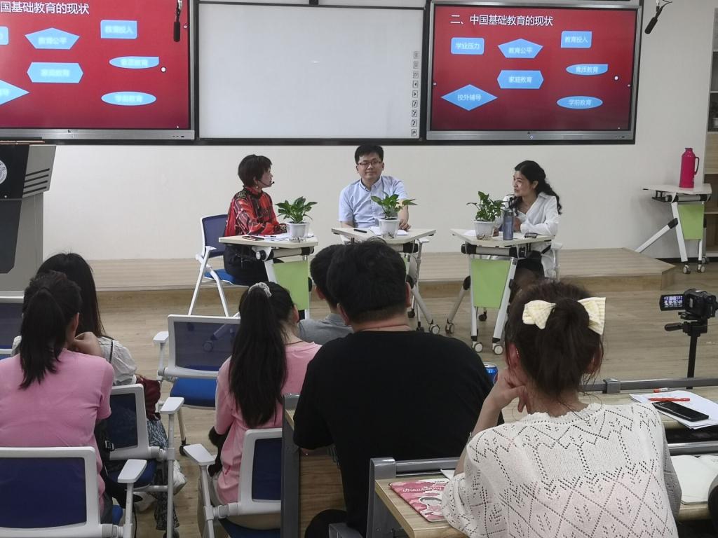 第二部分是本课程的核心部分,嘉宾和同学们围绕这“教育公平”“教育质量”“学业压力”“教育投入”“校外辅导”“家庭教育”“学前教育”等关键词展开讨论。赵含韫、刘英老师从自己孩子的“择校”经历谈到了教育资源分配还不够均衡的问题,党和政府正在着力解决这个问题,包括推进“改薄工程”、“教育集团化”“教师支教”等措施来缩小地域基础教育的差距。周继祥老师主要从介绍新加坡基础教育的分流制度来说明如何提高基础教育质量的问题,社会主义教育的本质是要实现每个人的全面发展,截止2018年,我国高中毛入学率已经达到88.8%,可以说基础教育的规模扩张已经基本结束,下一步是要走内涵建设的道路。关于基础教育的质量建设,近年来党和国家颁布了几个相关文件,中共中央、国务院《关于深化教育教学改革全面提高义务教育质量的意见》、国务院办公厅《关于新时代推进普通高中育人方式改革的指导意见》、教育部等六部门关于印发《义务教育质量评价指南》。近几年的职业教育改革、高中育人方式的改革,更多的强调个性化的教育,符合因材施教、适性扬才的教育原则,拓宽人才的成长之路。讲座期间,主讲嘉宾和主持人充分利用智慧课堂,通过学习通发布问卷、主题讨论等,学生积极参与,广泛讨论,讲述他们的亲身经历,课堂气氛活跃。