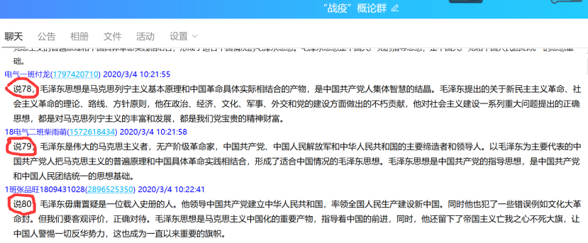 为了帮助和引导学生认真进行网络学习,我将课上活动和课下跟踪有机结合,以确保每个学生都能在特殊时期认真参与学习。在课堂上,我根据具体的课程内容设计讨论、抢答、测试等活动,帮助学生梳理和强化所学习的课程内容,通过“关于‘马克思主义中国化’的准确认识”“外国人眼中的中国精神”等问题的讨论,让学生明确了在“概论”课程学习中要准确理解马克思主义中国化的内容和意义。当课堂上出现学习平台拥堵无法开展学习活动时,我和同学们又迅速转场到事先建立的课程QQ群里进行讨论和问题解答,为避免大班学习中可能出现的同学游离现象,我让学生进行讨论接龙,对于缺额学生,我及时督促抓紧参与课程活动。在一次课上的两次平台签到中,有一位同学两次都没有签名,课后,我及时通过QQ电话联系学生,询问是因为网络问题还是因为没有参加学习,当了解到学生是因为网络不畅没有及时赶上两次签到后,我在后续的教学中,对凡是在平台没有签到的同学提醒他们在QQ群报数,并确认学生学习了课程内容。对课程讨论中出现的一些与课程无关的跑题内容时,我及时制止并提出讨论要求,对极个别疑难问题,则课后单独联系解答。一次课后为解决同学课上提出的“为什么发展到现在农民还很穷”的问题,我和同学交流了将近一个小时,并以我自身成长、家庭发展以及到国外的见闻引导学生要学会辩证全面地分析问题,并鼓励学生将来利用假期学习毛泽东的调查精神深入农村去做一些详实的调查,用一些经得住的证据来分析和解决问题。正是通过课后的及时的耐心交流,我较好地帮助学生认识到思政课学习的意义和大学生加强理论修养的必要性。