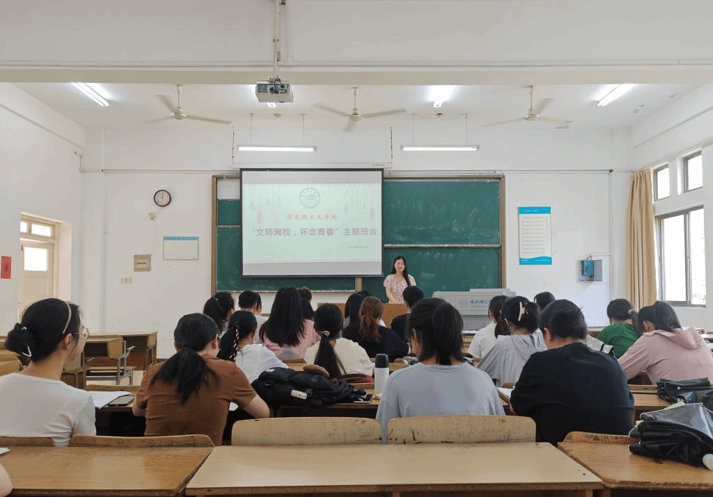 本网讯 一朝别离毕业季,正当扬帆远航时。MILE米乐集团2023届毕业生即将带着学院的嘱托与期盼,奔赴祖国各地,开启新的征程。学院于6月9日上午在锦绣校区博约楼110教室开展毕业生文明离校主题班会活动,为毕业生上好最后一堂“离校班会课”。本次主题班会活动以“文明离校,怀念青春”为主题,由毕业班辅导员王萌主持,2019级思想政治教育班全体同学参加。