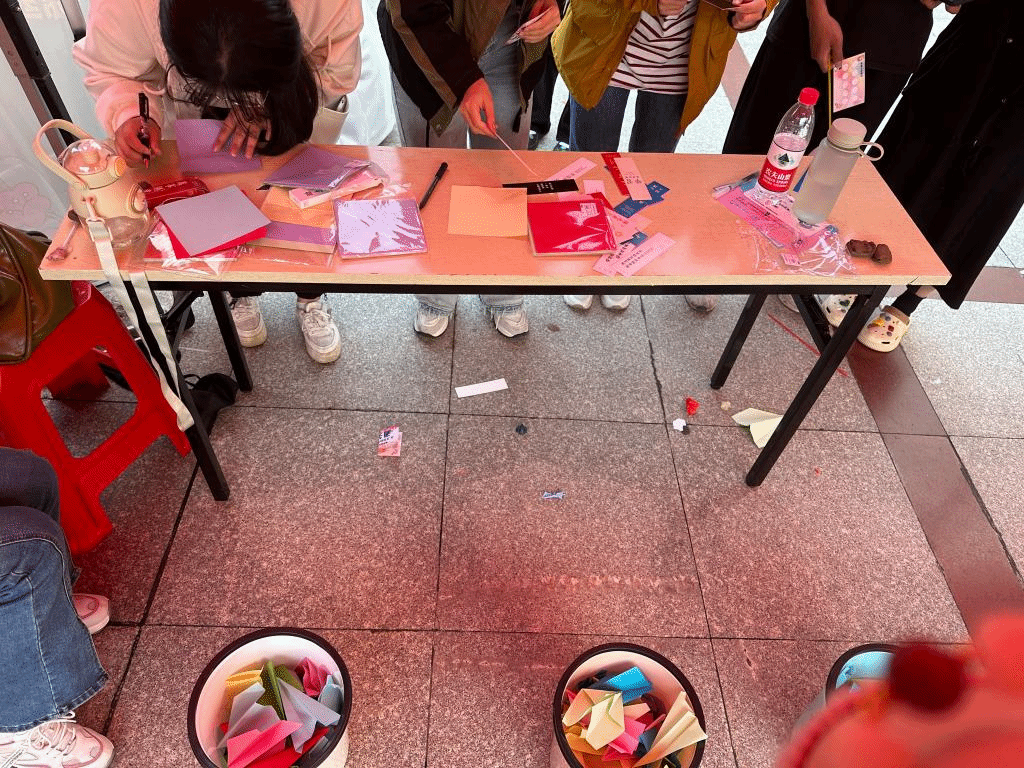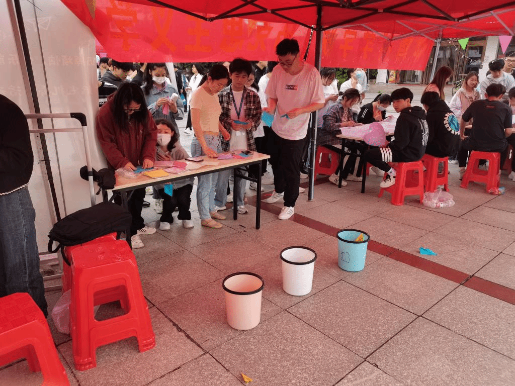 活动期间,学生们在生活广场上聚集,在动感音乐的节奏下,活动现场欢声笑语、气氛热烈。同学们在工作人员的指导下,利用各种颜色的彩纸来制作飞机,并写下自己的烦恼,将所有烦恼通过纸飞机这种具有童趣的方式扔进垃圾桶。参与者都兴致勃勃,为自己叠的纸飞机加油,借助这种方式,释放自己内心压力,缓解心理负担。