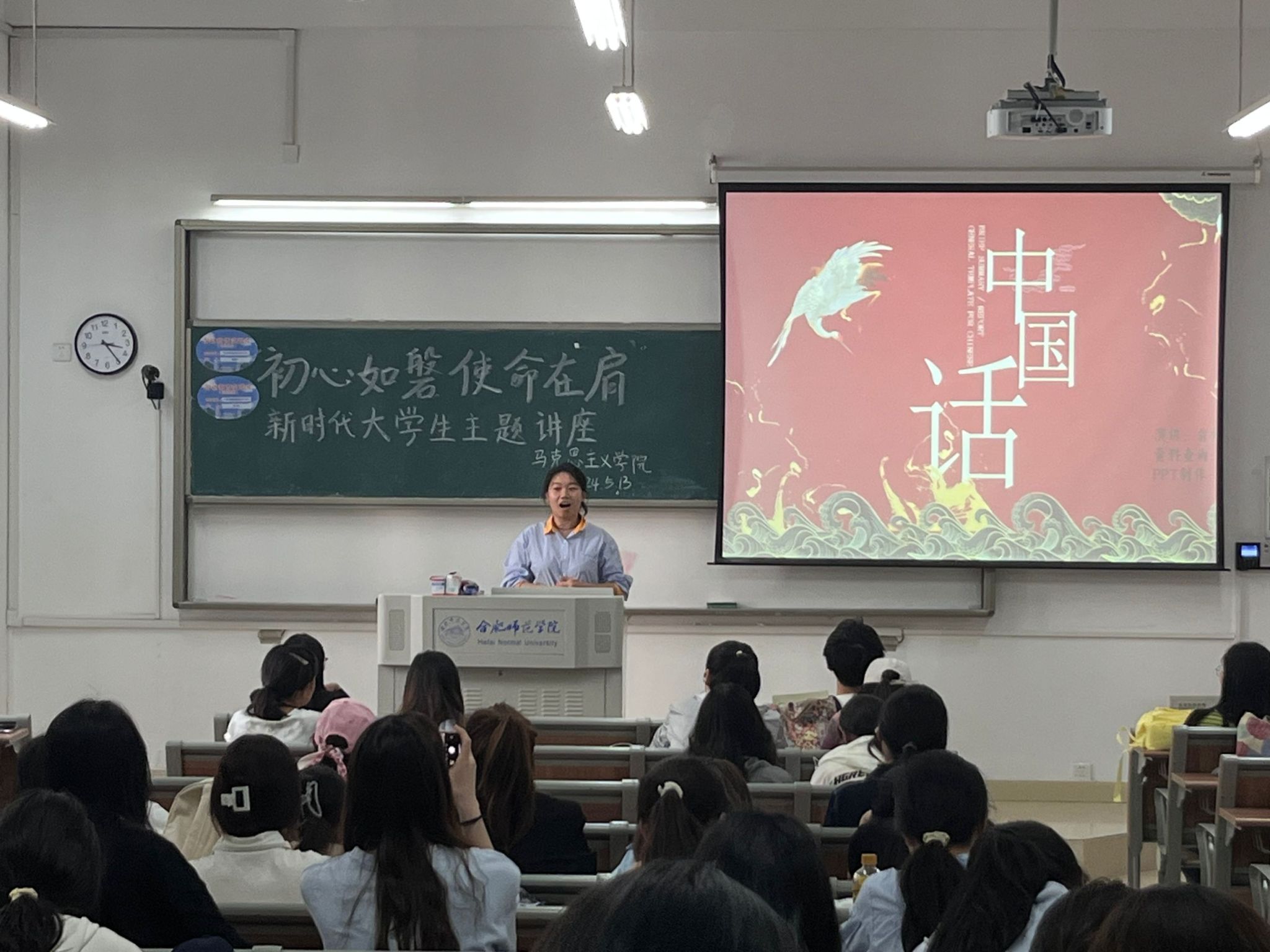 在主题讲座中,同学们激情澎湃,声情并茂。“今日之中国,山河壮丽、环境和谐”,2023级思想政治教育班余舒畅同学呼吁同学们要讲好“中国话”,以“长风破浪会有时”的豪迈,把爱国之情、强国之心、报国之心有机结合起来。作为青年学子,要在火热的青春中实现人生理想,在奋斗的青春中书写事业华章。