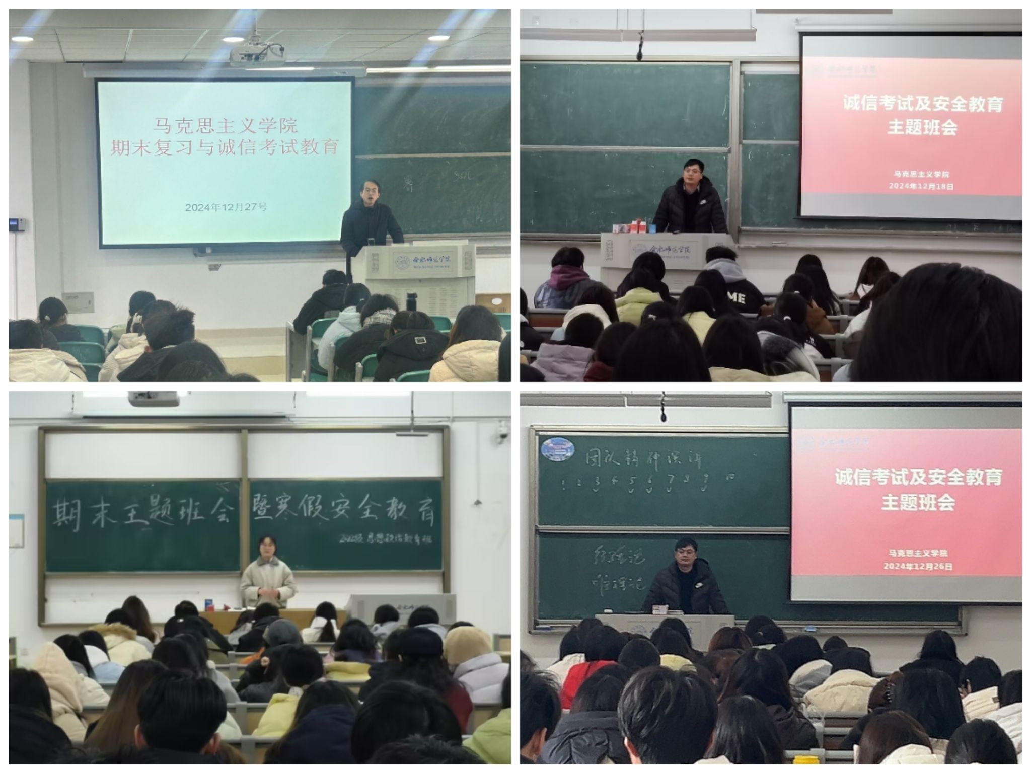 12月27日上午,学院在滨湖校区博学楼A203开展期末复习与诚信考试教育,并组织签订诚信考试承诺书。副院长方政与2023级、2024级思想政治教育专业200余名学生参加了本次活动。方政指出,学校高度重视学风建设,将2024年确立为“学风建设年”,考风是学风建设的重要抓手之一,希望同学们端正考风,严肃考纪,考出水平,考出风格。方政还与同学们交流了课程期末考试复习体会,强调期末复习不仅要识记课程基础知识与理论,还要注重总结与掌握课程整体逻辑与线索,强化对课程理论的理解,培育自身运用课程理论分析与解决问题的能力。