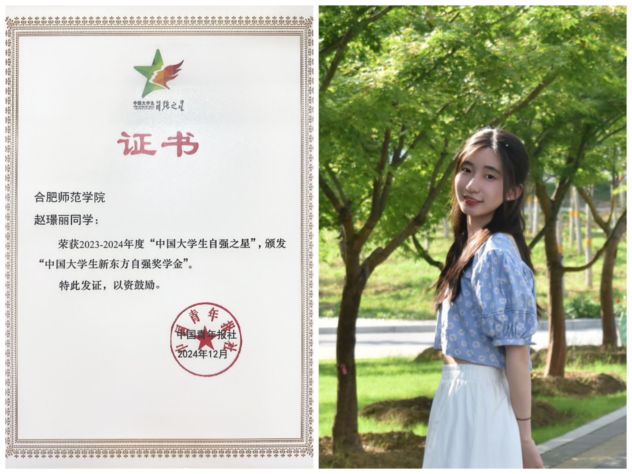 近日,由共青团中央、全国学联指导,中国青年报社、新东方教育科技集团联合举办的2023—2024年度“中国大学生自强之星”奖学金获得者名单正式揭晓,我院赵璟丽同学获评“中国大学生自强之星”荣誉称号。