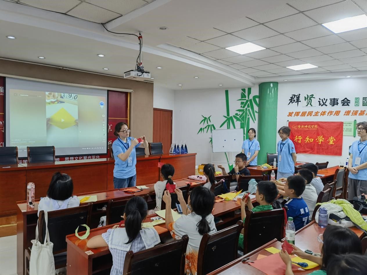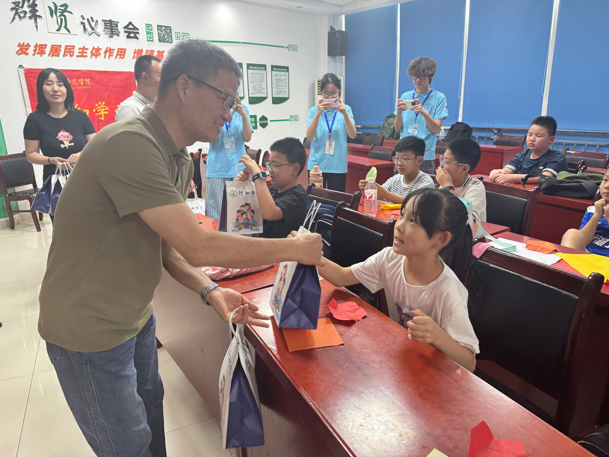活动现场,学院领导一行实地考察了行知学堂的教学环境,详细了解课程设置、活动开展及安全保障等情况,并现场观摩了“妙手生花”手工课程和小学员们精心准备的《少年中国说》手势舞表演。何光辉对"小先生"们的辛勤付出给予充分肯定,勉励大家要牢记"爱满天下,知行合一"的教育理念,在实践中增长才干、锤炼品格,要将专业所学与社会实践相结合,创新思政教育形式,为社区儿童成长成才贡献力量。