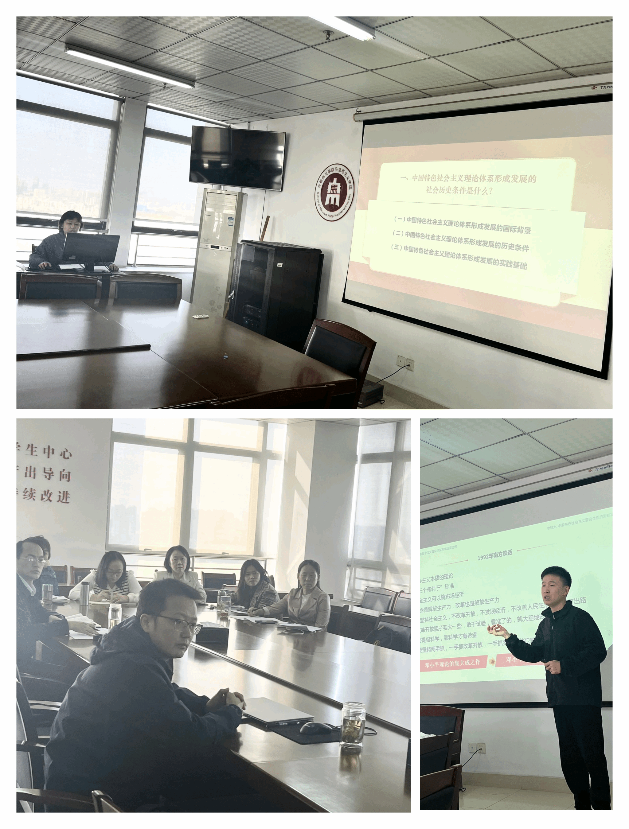 本次集体备课会由王宗双、陈露主讲,两位老师分别围绕课本第五章“中国特色社会主义理论体系的形成发展”内容进行现场教学展示,并围绕教学内容汇报了教学设计的思路。随后,全体教研室教师聚焦课程目标、教学内容、教学方法等方面开展了热烈的交流与讨论,大家逐个点评分析了两位老师的授课,并交流了自己的上课心得与经验。在听完了大家的发言后,方政对两位教师的教学展示表示肯定,并结合自身的教学实践强调,集体备课形式很好,有利于教师之间的交流和互动,实现资源共享,提高教师教学水平与教学效果。