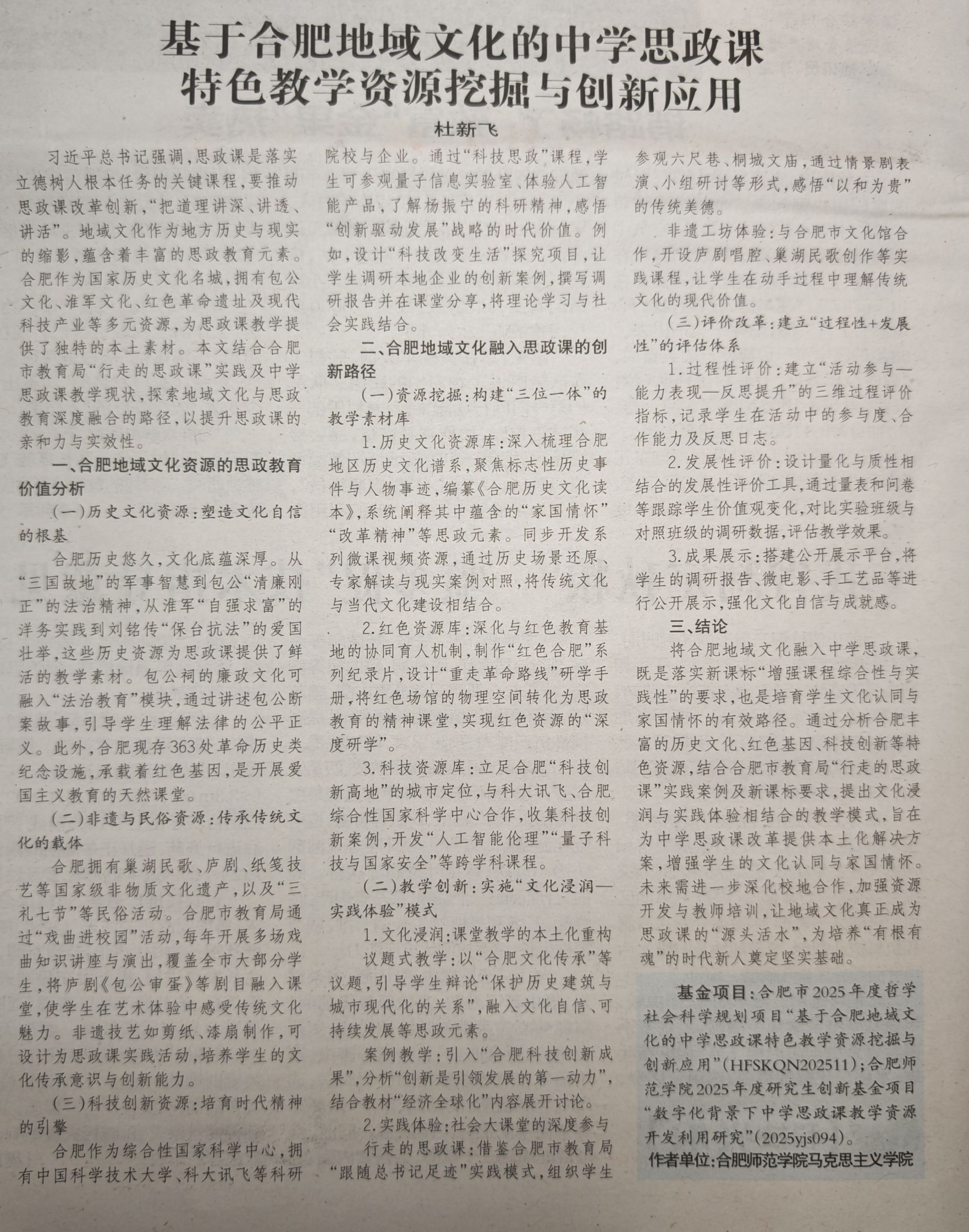 本次发表的文章是杜新飞的合肥市2025年度哲学社会科学规划项目“基于合肥地域文化的中学思政课特色教学资源挖掘与创新应用”(HFSKQN202511)和MILE米乐集团2025年度研究生创新基金项目“数字化背景下中学思政课教学资源开发利用研究”(2025yjs094)的阶段性成果。文章聚焦思政课建设主题,从合肥地域文化资源的思政教育价值分析、合肥地域文化融入思政课的创新路径、结论三方面展开论述,提出了通过“资源挖掘:构建‘三位一体’的教学素材库”“教学创新:实施‘文化浸润—实践体验’模式”“评价改革:建立‘过程性+发展性’的评估体系”创新路径,让合肥地域文化在中学思政课教学中展现魅力。